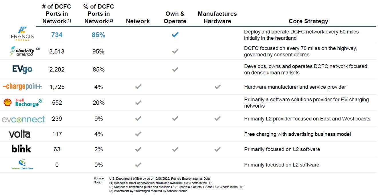 Francis currently owns and operates over 550 direct current fast charging (DCFC) EV stations, capable of fully charging EVs in 7-90 minutes. Francis is rapidly expanding its DCFC network across the country in public and private partnerships with Federal and state agencies. When completed, Francis Energy anticipates having over 50,000 DCFC ports under its management and/or ownership.